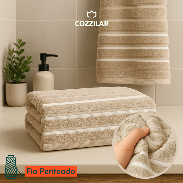 A Toalha de Banho Cozzilar foi desenvolvida para entregar conforto imediato após o banho, com fio penteado em algodão que proporciona toque macio e absorção eficiente. O tamanho grande (70 x 140 cm) garante cobertura confortável, enquanto a felpa volumosa aumenta a capacidade de secagem e a sensação de aconchego. Para completar, a barra decorativa valoriza o visual do banheiro sem abrir mão da durabilidade.